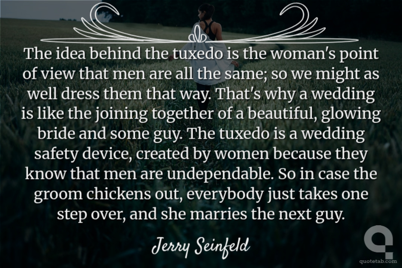 The idea behind the tuxedo is the woman's point of view that men are all the same; so we might as well dress them that way. That's why a wedding is like the joining together of a beautiful, glowing bride and some guy. The tuxedo is a wedding safety device, created by women because they know that men are undependable. So in case the groom chickens out, everybody just takes one step over, and she marries the next guy.