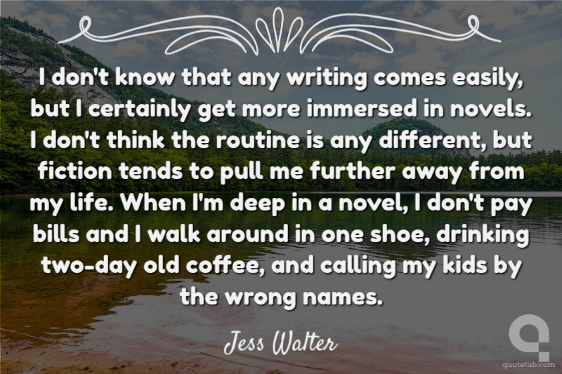 I don't know that any writing comes easily, but I certainly get more immersed in novels. I don't think the routine is any different, but fiction tends to pull me further away from my life. When I'm deep in a novel, I don't pay bills and I walk around in one shoe, drinking two-day old coffee, and calling my kids by the wrong names.