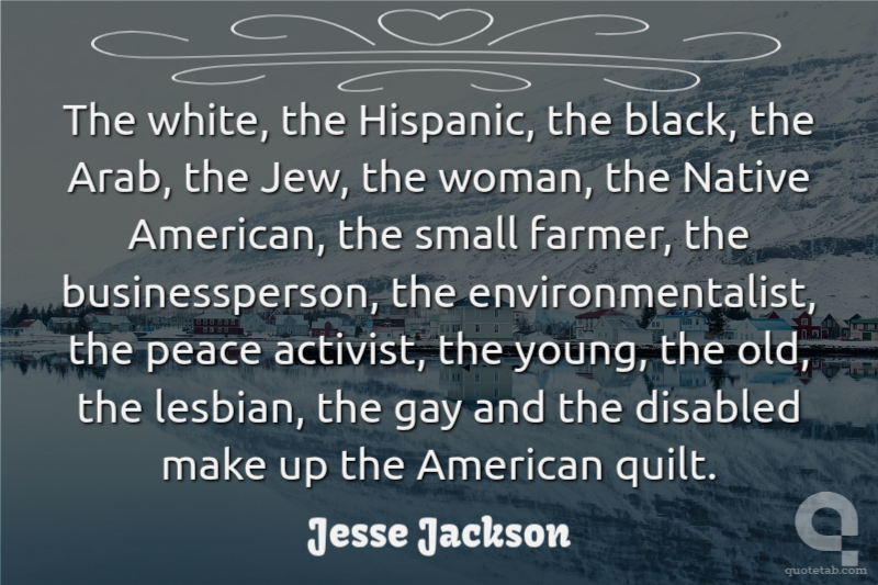 The white, the Hispanic, the black, the Arab, the Jew, the woman, the Native American, the small farmer, the businessperson, the environmentalist, the peace activist, the young, the old, the lesbian, the gay and the disabled make up the American quilt.
