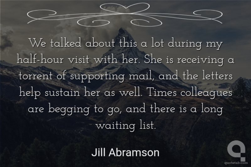 We talked about this a lot during my half-hour visit with her. She is receiving a torrent of supporting mail, and the letters help sustain her as well. Times colleagues are begging to go, and there is a long waiting list.