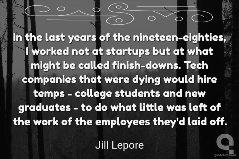 In the last years of the nineteen-eighties, I worked not at startups but at what might be called finish-downs. Tech companies that were dying would hire temps - college students and new graduates - to do what little was left of the work of the employees they'd laid off.
