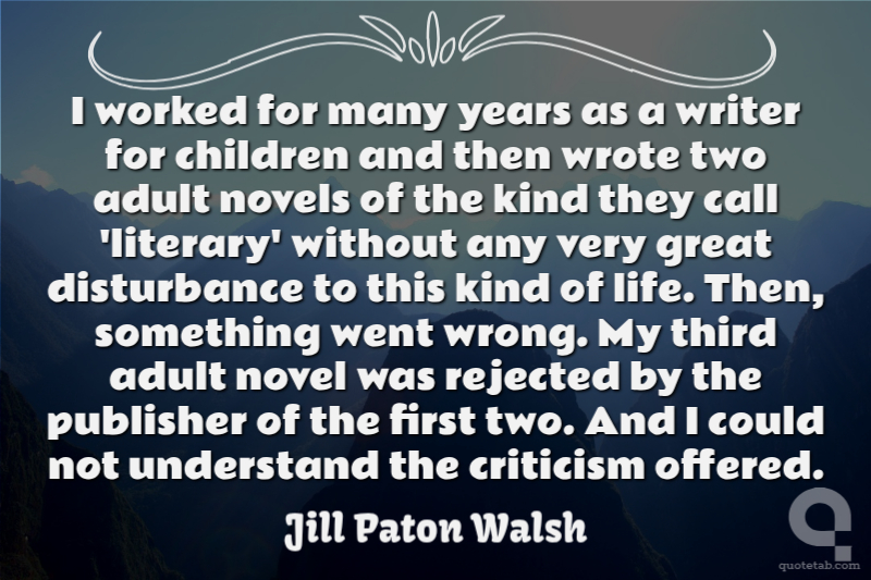 I worked for many years as a writer for children and then wrote two adult novels of the kind they call 'literary' without any very great disturbance to this kind of life. Then, something went wrong. My third adult novel was rejected by the publisher of the first two. And I could not understand the criticism offered.