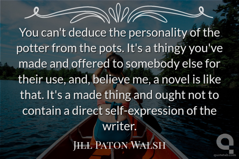 You can't deduce the personality of the potter from the pots. It's a thingy you've made and offered to somebody else for their use, and, believe me, a novel is like that. It's a made thing and ought not to contain a direct self-expression of the writer.