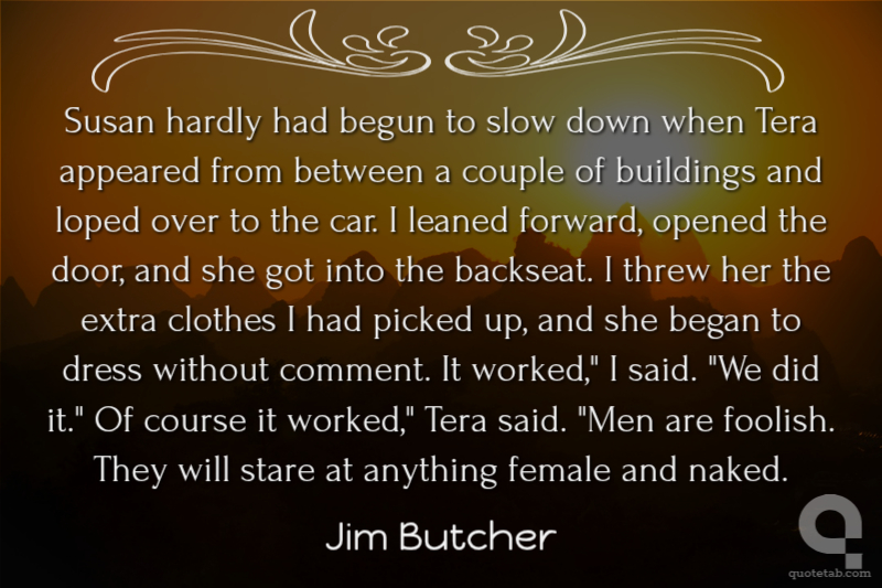 Susan hardly had begun to slow down when Tera appeared from between a couple of buildings and loped over to the car. I leaned forward, opened the door, and she got into the backseat. I threw her the extra clothes I had picked up, and she began to dress without comment. It worked," I said. "We did it." Of course it worked," Tera said. "Men are foolish. They will stare at anything female and naked.