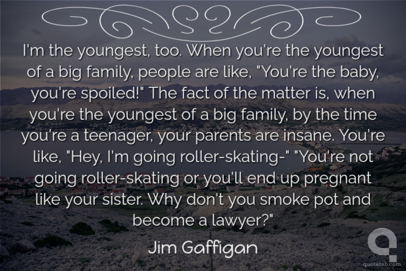 I'm the youngest, too. When you're the youngest of a big family, people are like, "You're the baby, you're spoiled!" The fact of the matter is, when you're the youngest of a big family, by the time you're a teenager, your parents are insane. You're like, "Hey, I'm going roller-skating-" "You're not going roller-skating or you'll end up pregnant like your sister. Why don't you smoke pot and become a lawyer?"