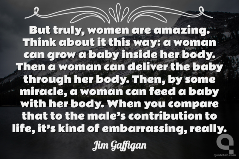 But truly, women are amazing. Think about it this way: a woman can grow a baby inside her body. Then a woman can deliver the baby through her body. Then, by some miracle, a woman can feed a baby with her body. When you compare that to the male’s contribution to life, it’s kind of embarrassing, really.