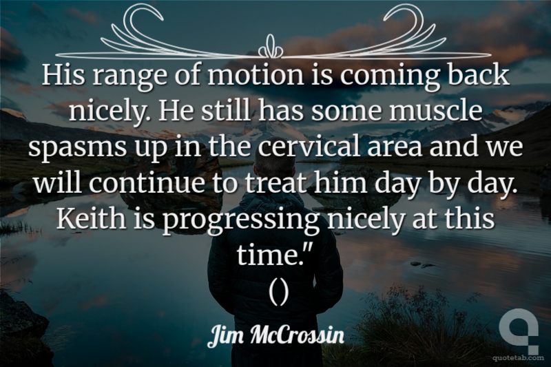 His range of motion is coming back nicely. He still has some muscle spasms up in the cervical area and we will continue to treat him day by day. Keith is progressing nicely at this time." ()