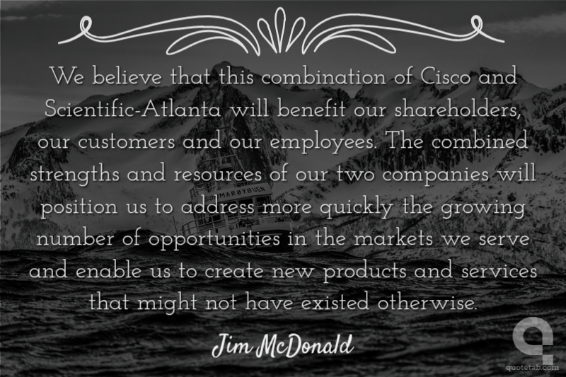 We believe that this combination of Cisco and Scientific-Atlanta will benefit our shareholders, our customers and our employees. The combined strengths and resources of our two companies will position us to address more quickly the growing number of opportunities in the markets we serve and enable us to create new products and services that might not have existed otherwise.