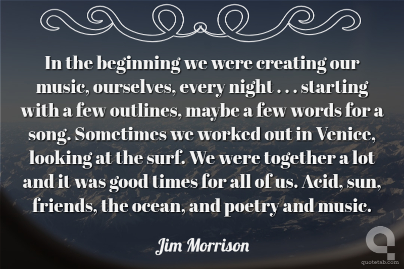 In the beginning we were creating our music, ourselves, every night . . . starting with a few outlines, maybe a few words for a song. Sometimes we worked out in Venice, looking at the surf. We were together a lot and it was good times for all of us. Acid, sun, friends, the ocean, and poetry and music.