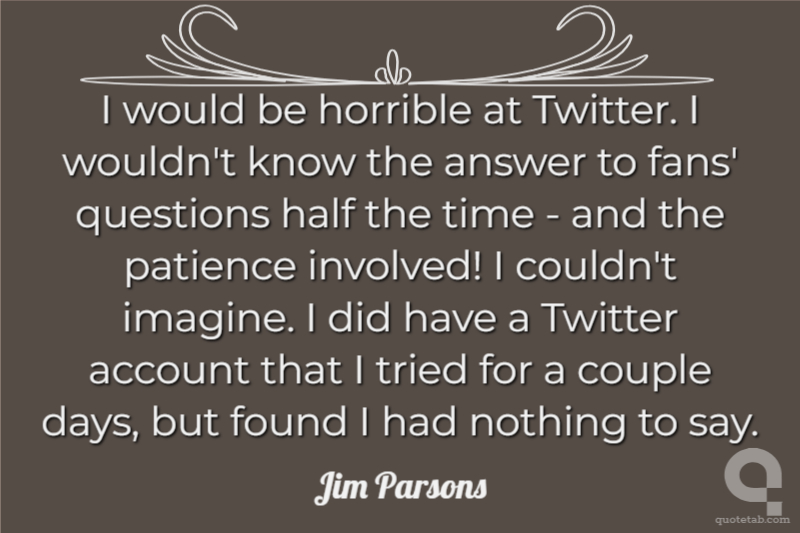 I would be horrible at Twitter. I wouldn't know the answer to fans' questions half the time - and the patience involved! I couldn't imagine. I did have a Twitter account that I tried for a couple days, but found I had nothing to say.