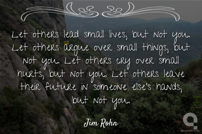 Let others lead small lives, but not you. Let others argue over small things, but not you. Let others cry over small hurts, but not you. Let others leave their future in someone else's hands, but not you.
