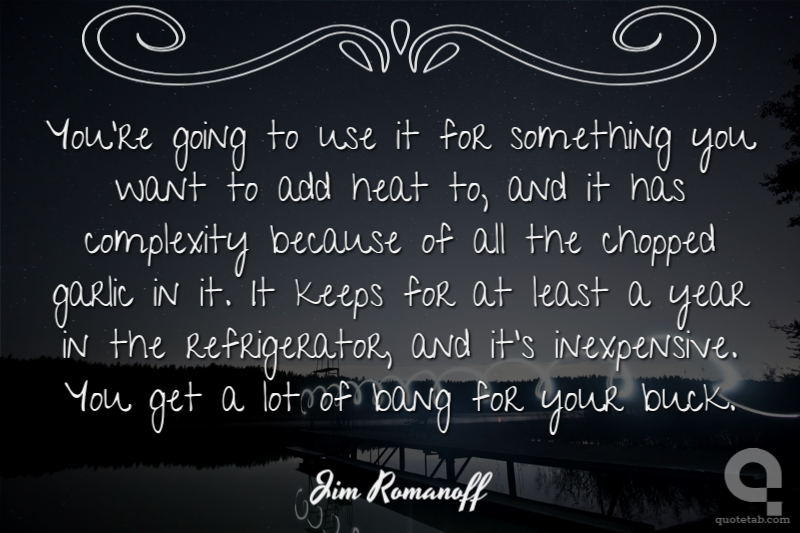 You're going to use it for something you want to add heat to, and it has complexity because of all the chopped garlic in it. It keeps for at least a year in the refrigerator, and it's inexpensive. You get a lot of bang for your buck.