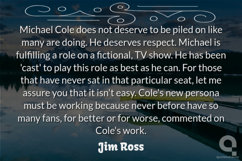 Michael Cole does not deserve to be piled on like many are doing. He deserves respect. Michael is fulfilling a role on a fictional, TV show. He has been 'cast' to play this role as best as he can. For those that have never sat in that particular seat, let me assure you that it isn't easy. Cole's new persona must be working because never before have so many fans, for better or for worse, commented on Cole's work.