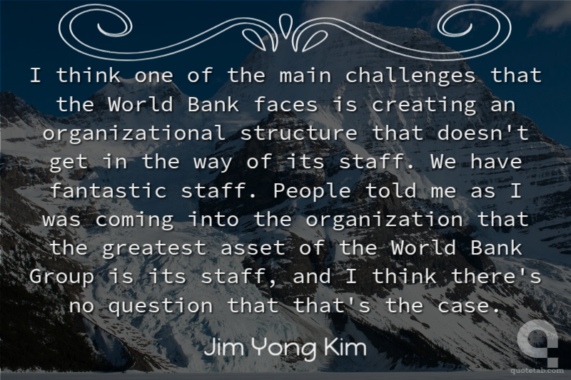 I think one of the main challenges that the World Bank faces is creating an organizational structure that doesn't get in the way of its staff. We have fantastic staff. People told me as I was coming into the organization that the greatest asset of the World Bank Group is its staff, and I think there's no question that that's the case.