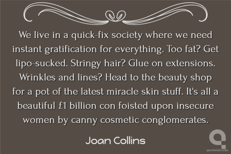 We live in a quick-fix society where we need instant gratification for everything. Too fat? Get lipo-sucked. Stringy hair? Glue on extensions. Wrinkles and lines? Head to the beauty shop for a pot of the latest miracle skin stuff. It's all a beautiful £1 billion con foisted upon insecure women by canny cosmetic conglomerates.