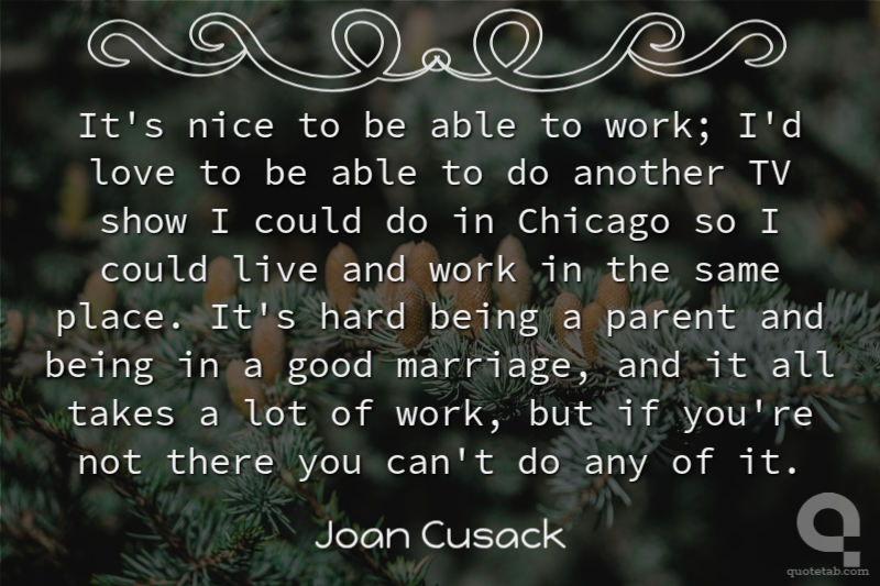 It's nice to be able to work; I'd love to be able to do another TV show I could do in Chicago so I could live and work in the same place. It's hard being a parent and being in a good marriage, and it all takes a lot of work, but if you're not there you can't do any of it.