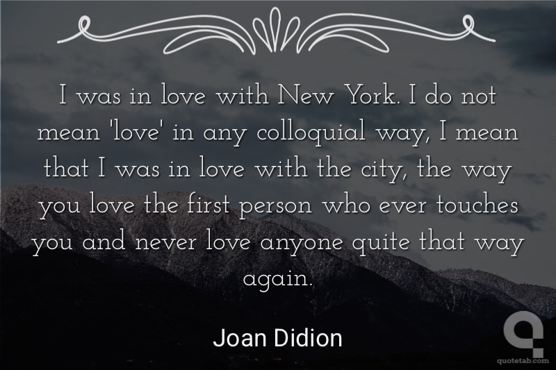 I was in love with New York. I do not mean 'love' in any colloquial way, I mean that I was in love with the city, the way you love the first person who ever touches you and never love anyone quite that way again.
