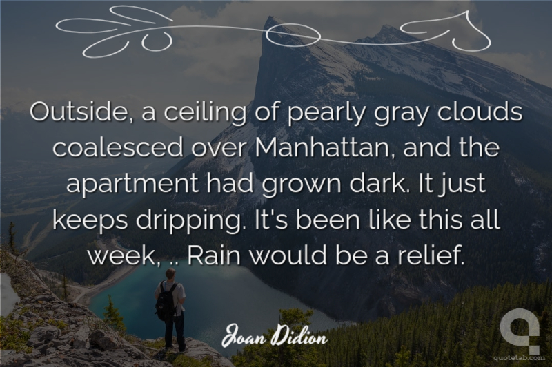 Outside, a ceiling of pearly gray clouds coalesced over Manhattan, and the apartment had grown dark. It just keeps dripping. It's been like this all week, .. Rain would be a relief.