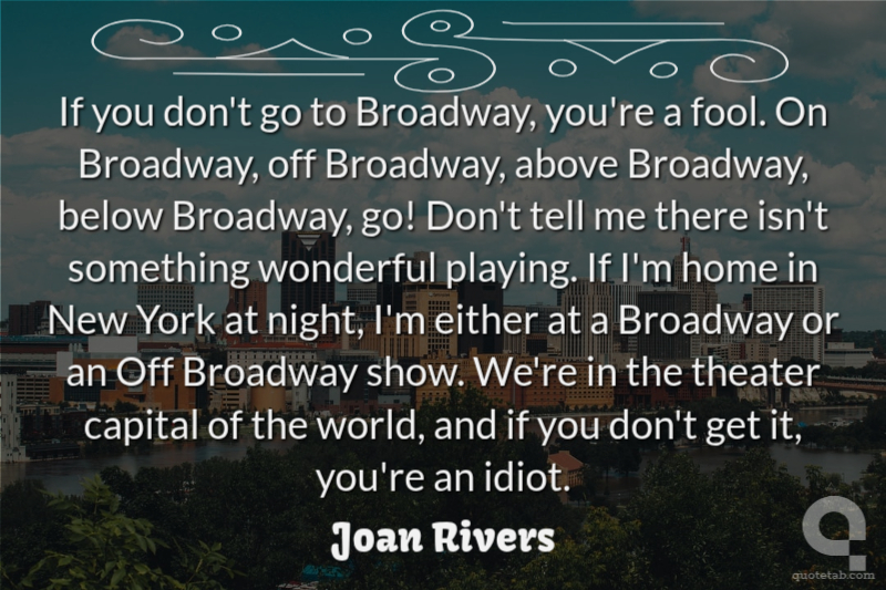 If you don't go to Broadway, you're a fool. On Broadway, off Broadway, above Broadway, below Broadway, go! Don't tell me there isn't something wonderful playing. If I'm home in New York at night, I'm either at a Broadway or an Off Broadway show. We're in the theater capital of the world, and if you don't get it, you're an idiot.