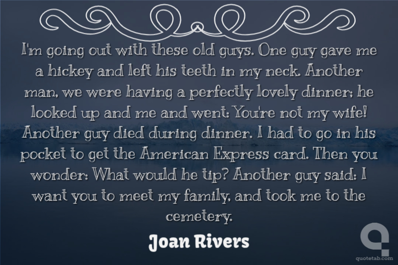 I'm going out with these old guys. One guy gave me a hickey and left his teeth in my neck. Another man, we were having a perfectly lovely dinner; he looked up and me and went: You're not my wife! Another guy died during dinner. I had to go in his pocket to get the American Express card. Then you wonder: What would he tip? Another guy said: I want you to meet my family, and took me to the cemetery.