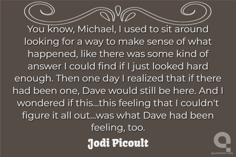 You know, Michael, I used to sit around looking for a way to make sense of what happened, like there was some kind of answer I could find if I just looked hard enough. Then one day I realized that if there had been one, Dave would still be here. And I wondered if this...this feeling that I couldn't figure it all out...was what Dave had been feeling, too.