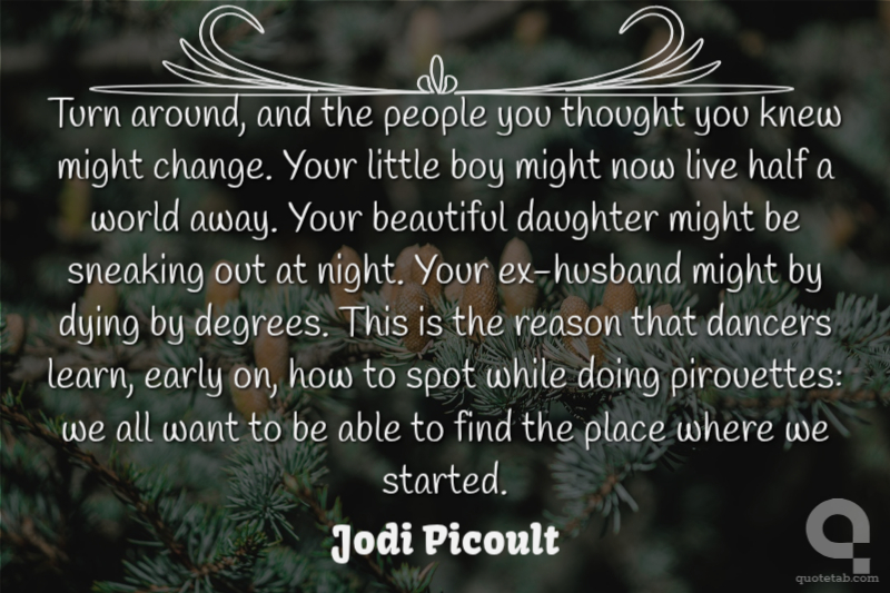 Turn around, and the people you thought you knew might change. Your little boy might now live half a world away. Your beautiful daughter might be sneaking out at night. Your ex-husband might by dying by degrees. This is the reason that dancers learn, early on, how to spot while doing pirouettes: we all want to be able to find the place where we started.