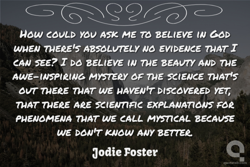How could you ask me to believe in God when there's absolutely no evidence that I can see? I do believe in the beauty and the awe-inspiring mystery of the science that's out there that we haven't discovered yet, that there are scientific explanations for phenomena that we call mystical because we don't know any better.