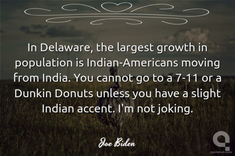 In Delaware, the largest growth in population is Indian-Americans moving from India. You cannot go to a 7-11 or a Dunkin Donuts unless you have a slight Indian accent. I'm not joking.