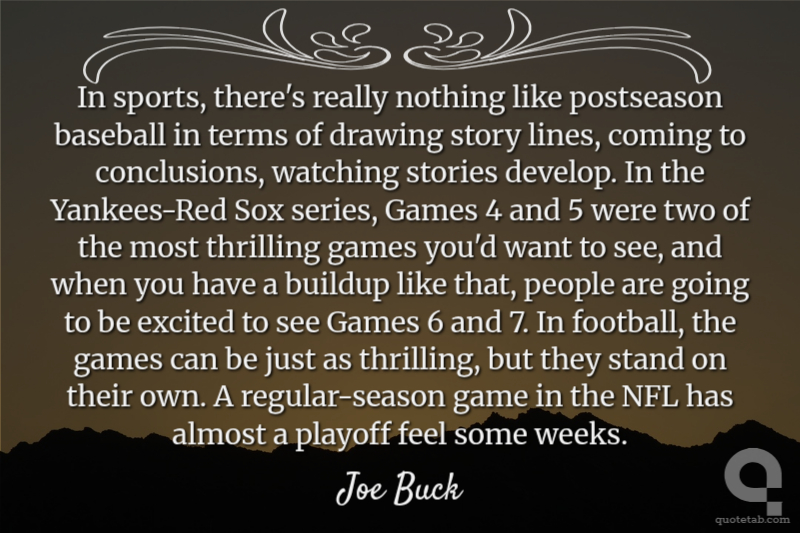 In sports, there's really nothing like postseason baseball in terms of drawing story lines, coming to conclusions, watching stories develop. In the Yankees-Red Sox series, Games 4 and 5 were two of the most thrilling games you'd want to see, and when you have a buildup like that, people are going to be excited to see Games 6 and 7. In football, the games can be just as thrilling, but they stand on their own. A regular-season game in the NFL has almost a playoff feel some weeks.