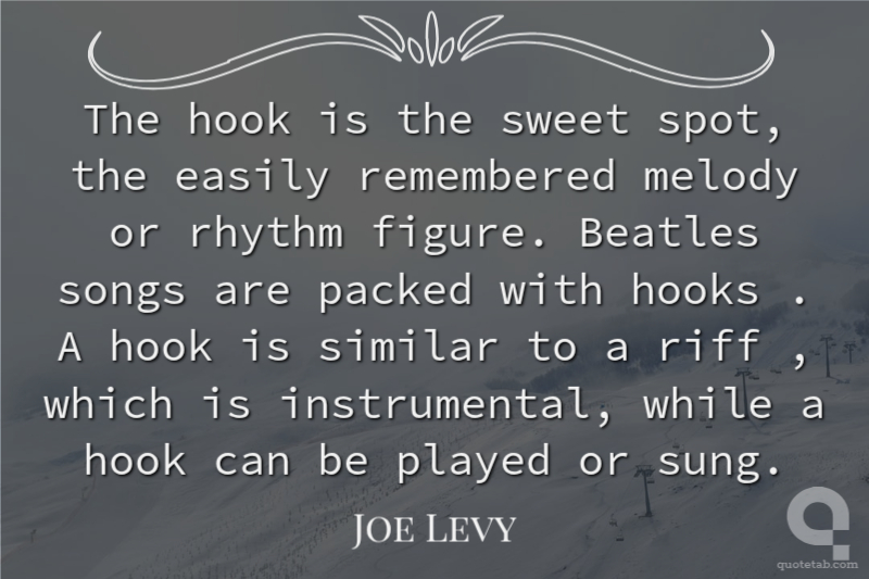 The hook is the sweet spot, the easily remembered melody or rhythm figure. Beatles songs are packed with hooks . A hook is similar to a riff , which is instrumental, while a hook can be played or sung.