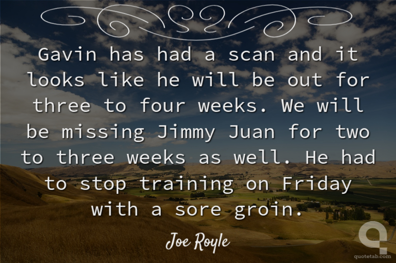Gavin has had a scan and it looks like he will be out for three to four weeks. We will be missing Jimmy Juan for two to three weeks as well. He had to stop training on Friday with a sore groin.