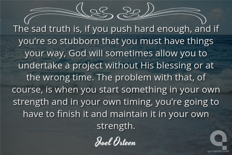 The sad truth is, if you push hard enough, and if you’re so stubborn that you must have things your way, God will sometimes allow you to undertake a project without His blessing or at the wrong time. The problem with that, of course, is when you start something in your own strength and in your own timing, you’re going to have to finish it and maintain it in your own strength.