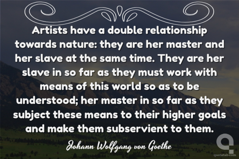 Artists have a double relationship towards nature: they are her master and her slave at the same time. They are her slave in so far as they must work with means of this world so as to be understood; her master in so far as they subject these means to their higher goals and make them subservient to them.