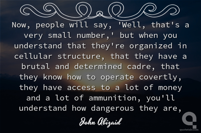 Now, people will say, 'Well, that's a very small number,' but when you understand that they're organized in cellular structure, that they have a brutal and determined cadre, that they know how to operate covertly, they have access to a lot of money and a lot of ammunition, you'll understand how dangerous they are,