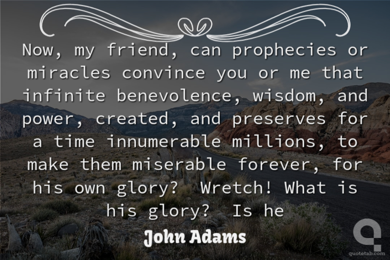 Now, my friend, can prophecies or miracles convince you or me that infinite benevolence, wisdom, and power, created, and preserves for a time innumerable millions, to make them miserable forever, for his own glory? Wretch! What is his glory? Is he
