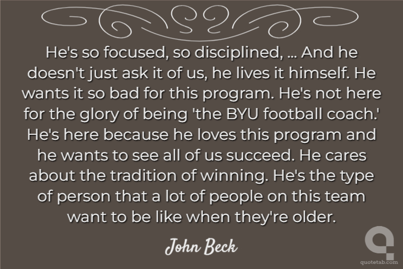 He's so focused, so disciplined, ... And he doesn't just ask it of us, he lives it himself. He wants it so bad for this program. He's not here for the glory of being 'the BYU football coach.' He's here because he loves this program and he wants to see all of us succeed. He cares about the tradition of winning. He's the type of person that a lot of people on this team want to be like when they're older.