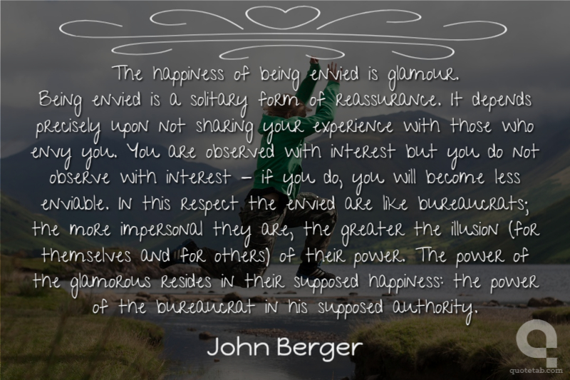 The happiness of being envied is glamour. Being envied is a solitary form of reassurance. It depends precisely upon not sharing your experience with those who envy you. You are observed with interest but you do not observe with interest - if you do, you will become less enviable. In this respect the envied are like bureaucrats; the more impersonal they are, the greater the illusion (for themselves and for others) of their power. The power of the glamorous resides in their supposed happiness: the power of the bureaucrat in his supposed authority.