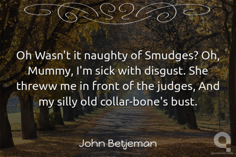 Oh Wasn't it naughty of Smudges? Oh, Mummy, I'm sick with disgust. She threww me in front of the judges, And my silly old collar-bone's bust.