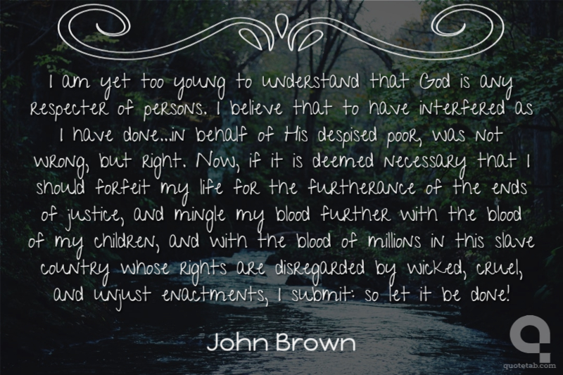 I am yet too young to understand that God is any respecter of persons. I believe that to have interfered as I have done...in behalf of His despised poor, was not wrong, but right. Now, if it is deemed necessary that I should forfeit my life for the furtherance of the ends of justice, and mingle my blood further with the blood of my children, and with the blood of millions in this slave country whose rights are disregarded by wicked, cruel, and unjust enactments, I submit: so let it be done!