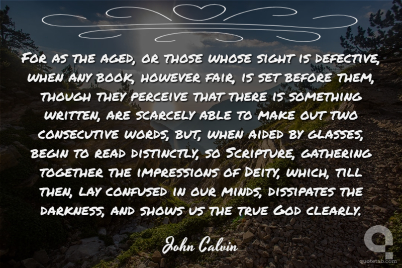 For as the aged, or those whose sight is defective, when any book, however fair, is set before them, though they perceive that there is something written, are scarcely able to make out two consecutive words, but, when aided by glasses, begin to read distinctly, so Scripture, gathering together the impressions of Deity, which, till then, lay confused in our minds, dissipates the darkness, and shows us the true God clearly.