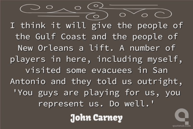 I think it will give the people of the Gulf Coast and the people of New Orleans a lift. A number of players in here, including myself, visited some evacuees in San Antonio and they told us outright, 'You guys are playing for us, you represent us. Do well.'