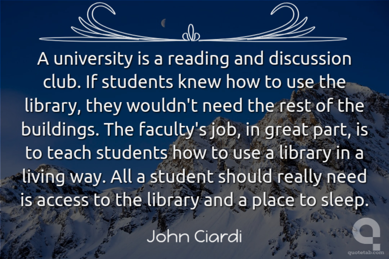 A university is a reading and discussion club. If students knew how to use the library, they wouldn't need the rest of the buildings. The faculty's job, in great part, is to teach students how to use a library in a living way. All a student should really need is access to the library and a place to sleep.