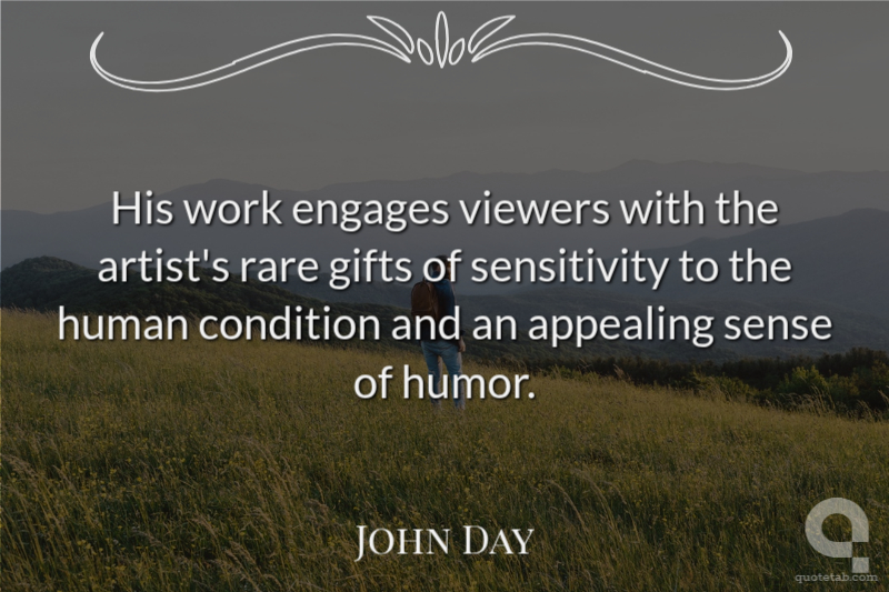 His work engages viewers with the artist's rare gifts of sensitivity to the human condition and an appealing sense of humor.