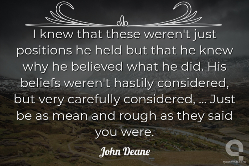 I knew that these weren't just positions he held but that he knew why he believed what he did. His beliefs weren't hastily considered, but very carefully considered, ... Just be as mean and rough as they said you were.