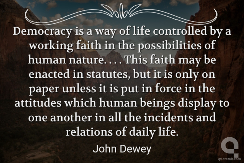 Democracy is a way of life controlled by a working faith in the possibilities of human nature. . . . This faith may be enacted in statutes, but it is only on paper unless it is put in force in the attitudes which human beings display to one another in all the incidents and relations of daily life.
