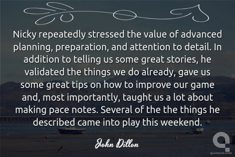 Nicky repeatedly stressed the value of advanced planning, preparation, and attention to detail. In addition to telling us some great stories, he validated the things we do already, gave us some great tips on how to improve our game and, most importantly, taught us a lot about making pace notes. Several of the the things he described came into play this weekend.