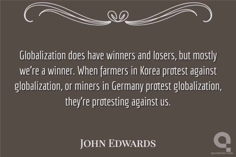 Globalization does have winners and losers, but mostly we're a winner. When farmers in Korea protest against globalization, or miners in Germany protest globalization, they're protesting against us.