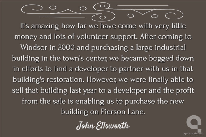 It's amazing how far we have come with very little money and lots of volunteer support. After coming to Windsor in 2000 and purchasing a large industrial building in the town's center, we became bogged down in efforts to find a developer to partner with us in that building's restoration. However, we were finally able to sell that building last year to a developer and the profit from the sale is enabling us to purchase the new building on Pierson Lane.