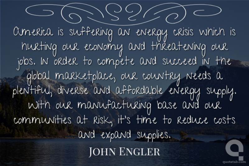 America is suffering an energy crisis which is hurting our economy and threatening our jobs. In order to compete and succeed in the global marketplace, our country needs a plentiful, diverse and affordable energy supply. With our manufacturing base and our communities at risk, it's time to reduce costs and expand supplies.