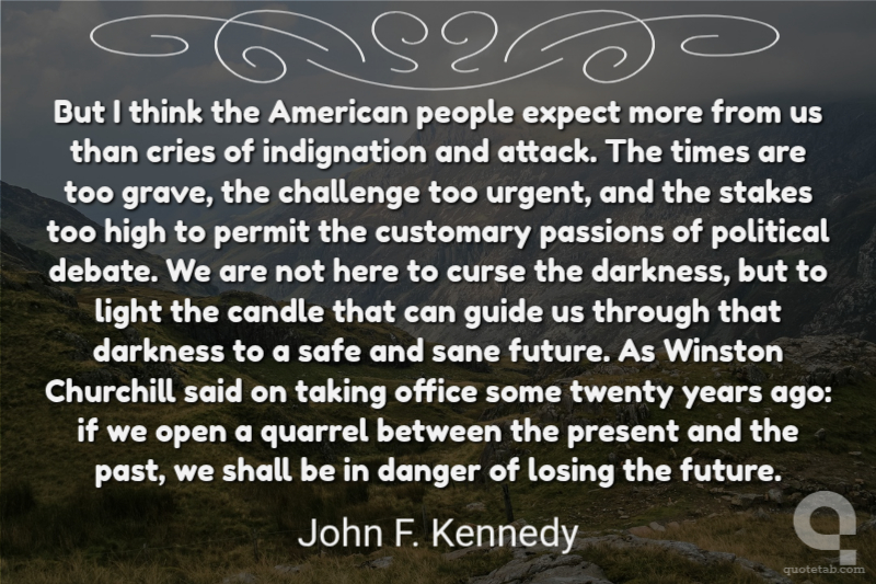 But I think the American people expect more from us than cries of indignation and attack. The times are too grave, the challenge too urgent, and the stakes too high to permit the customary passions of political debate. We are not here to curse the darkness, but to light the candle that can guide us through that darkness to a safe and sane future. As Winston Churchill said on taking office some twenty years ago: if we open a quarrel between the present and the past, we shall be in danger of losing the future.